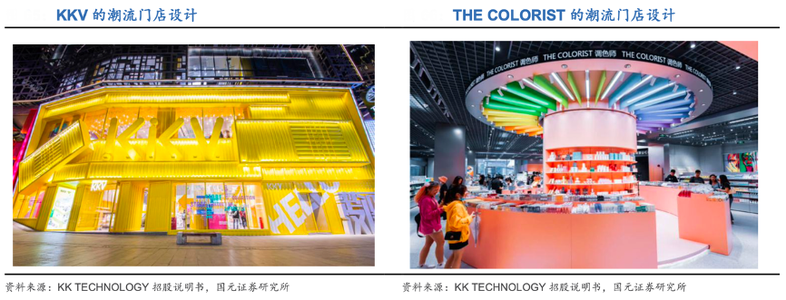 經(jīng)典案例:根據(jù)KK TECHNOLOGY招股說明書、國元證券研究所等綜合資訊表明,KK集團以“小清新”的彩色元素為特點,從空間布置、色彩搭配、產(chǎn)品陳列等維度升級門店場景。KKV門店采用“明黃色+集 裝箱”元素的造型,以獨特的色調和場景設計引人注目;THE COLORIST 通過彩虹 美妝蛋墻、彩虹色口紅墻等產(chǎn)品與場景的組合打造沉浸式消費體驗。
