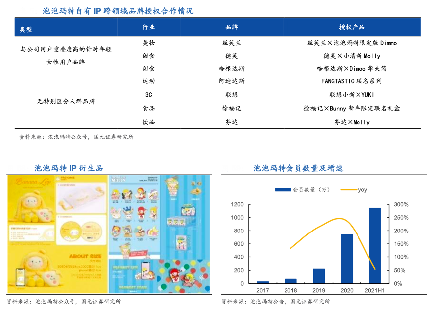 經(jīng)典案例:根據(jù)泡泡瑪特公眾號、泡泡瑪特公告、國元證券研究所等綜合資訊表明,潮流零售品牌商多通過老IP 新造型新衍生品、連續(xù)舉辦主題展、授權跨領域聯(lián)名等方式提升 IP 影響力、延長 IP 生命周期。以泡泡瑪 特為例,其 于2019年底至 2020 年初在中國七大城市連續(xù)舉辦以熱門 IP 為核心 的主題展,在此期間宣傳、促銷節(jié)日或地區(qū)限定產(chǎn)品;與絲芙蘭、德芙、哈根達斯、 阿迪達斯運動、徐福記、芬達等多行業(yè)品牌推出聯(lián)名商品,提升 IP 知名度。根據(jù)泡泡瑪特公告,2021H1 公司會員數(shù)量達 1141.5 萬人,同比增長 54%,會員復購率達 49%,會員銷售額貢獻達 91.8%。