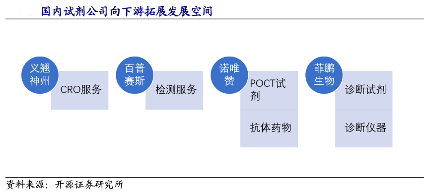 經(jīng)典案例:根據(jù)開源證券研究所等綜合資訊表明,依托在上游生物試劑研發(fā)、生產(chǎn)等優(yōu)勢,各公司在不斷開發(fā)生物試劑產(chǎn)品種類的同時,紛紛向下游客戶拓展附加服務(wù)或開發(fā)下游終端產(chǎn)品,進(jìn)一步打開公司的發(fā)展空間。義翹神州可以向科研單位及醫(yī)藥研發(fā)、生物技術(shù)企業(yè)提供重組蛋白表達(dá)純化、抗體開發(fā)與生產(chǎn)等定制化服務(wù);百普賽斯為下游客戶提供分子互作分析檢測、抗獨(dú)特型抗體開發(fā)的檢測服務(wù)等。