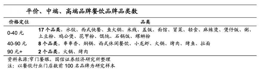 經(jīng)典案例:根據(jù)窄門睜眼、國信證券經(jīng)濟研究所等綜合資訊表明,以中國餐飲行業(yè)門店規(guī)模前 100 名品牌為例,平價(0-40 元)、中端(40-90 元)、高端(>90 元)三類門店數(shù)占比分別為 76%、17%、7%,以品牌價格定位為縱軸,餐飲行 業(yè)市場結(jié)構(gòu)呈現(xiàn)正金字塔形,從門店規(guī)模角度而言,即平價餐飲>中端餐飲>高 端定位餐飲市場規(guī)模。同時三個價格定位帶品類也呈現(xiàn)遞減趨勢,76 個平價(快 餐)品牌中共有 17 個細分品類,涵蓋西式快餐(漢堡/薯條/披薩)、拉面、蓋飯、黃燜雞、米線、麻辣燙等品類。