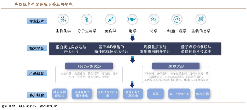 經(jīng)典案例:根據(jù)招股說明書、德邦研究所等綜合資訊表明,諾唯贊公司基于其獨(dú)立的技術(shù)平臺,拓展了廣泛的下游應(yīng)用領(lǐng)域。1)其推出包含 PCR 系列、qPCR 系列、分子克隆系列、逆轉(zhuǎn)錄系列等多個(gè)系列的生物試劑以及包含心腦血管、炎癥感染、優(yōu)生優(yōu)育、胃功能等 8 個(gè)系列的 POCT 診斷試劑;2)形成了多重客戶群體組合:科研院校、高通量測序服務(wù)企業(yè)、分子診斷試劑生產(chǎn)企業(yè)、制藥企業(yè)、CRO 企業(yè)、醫(yī)院等醫(yī)療機(jī)構(gòu)。