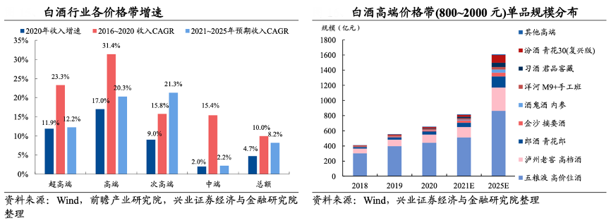 經(jīng)典案例:根據(jù)wind、前瞻產(chǎn)業(yè)研究院、興業(yè)證券經(jīng)濟與金融研究院等綜合資訊表明,從高端價格帶格局來看,由于高端品牌積淀具備強壁壘,高端入場券稀缺,頭部品牌將充分享受千元價格帶擴容紅利。由于高端形象需要深厚的歷史文化積淀及品牌心智占領(lǐng),頭部品牌馬太效應明顯,預計高端品牌競爭格局保持穩(wěn)定。參考頭部品牌十四五增長規(guī)劃,預計超高端價格帶(2000+元)未來 5 年將達到 1500 億元規(guī)模,對應 5 年 CAGR 約為 12%;高端價格帶(800~2000 元)未來 5 年將達到 1600 億元規(guī)模,對應 5 年 CAGR 約為 20%。