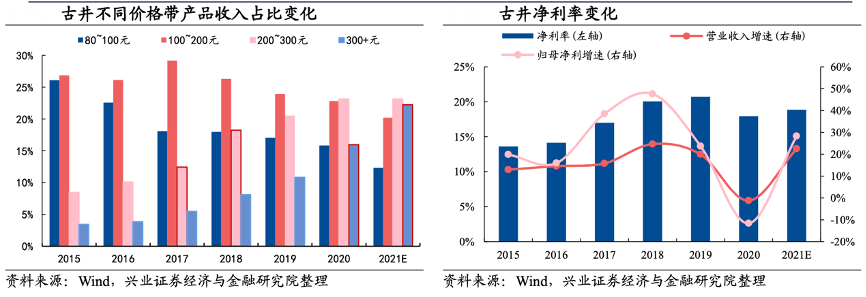 經(jīng)典案例:根據(jù)wind、興業(yè)證券經(jīng)濟與金融研究院等綜合資訊表明,2021 年以來,受益安徽省內(nèi)大眾消費價格帶全面向 120~200 元升級,鄉(xiāng)鎮(zhèn)宴席及送禮產(chǎn)品全面向古 8、洞 6/洞 9 等產(chǎn)品切換,同時商務消費價格帶向 600 元價位 擴張,古井公司果斷以古 20 提價布局這一新興價位,古 16 性價比也相應得到凸顯。
