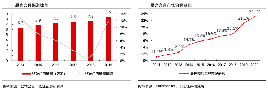 經(jīng)典案例:根據(jù)公司公告、Euromonitor、長江證券研究所等綜合資訊表明,晨光歷經(jīng) 20 余年發(fā)展,憑借產(chǎn)品快速迭代和終端渠道強管控,目前擁有超過 8 萬家終端渠道,占全國總校邊店數(shù)量近40%,2020年晨光在書寫文具中份額達 23.1%,是第二名得力的 3 倍以上(備注:來自歐睿數(shù)據(jù))。