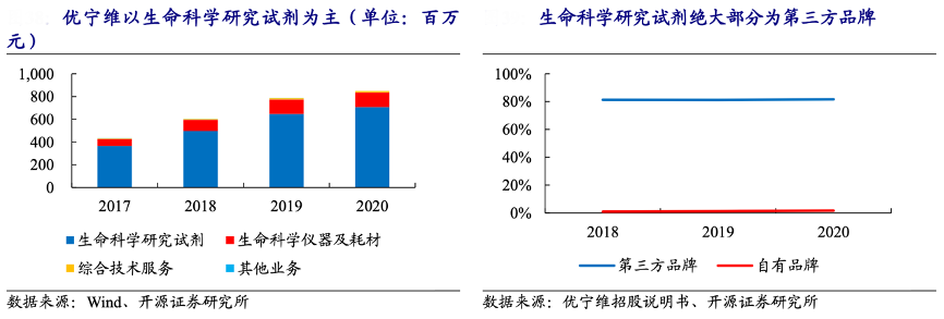 經(jīng)典案例:根據(jù)wind、優(yōu)寧維招股說(shuō)明書(shū)、開(kāi)源證券研究所等綜合資訊表明,優(yōu)寧維主要業(yè)務(wù)包括生命科學(xué)研究試劑和生命科學(xué)儀器和耗材,其中科研試劑為主要的收入來(lái)源,占總營(yíng)業(yè)收入的比例維持在 83%左右;在科研試劑中,絕大部分為代理的第三方品牌產(chǎn)品,占總收入比例為81%左右,自有品牌的產(chǎn)品占比較低,僅為1%左右。