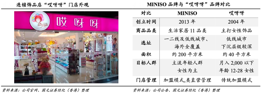 經(jīng)典案例:根據(jù)公司官網(wǎng)、公司公告、國(guó)元證券經(jīng)紀(jì)(香港)等綜合資訊表明,從哎呀呀到 MINISO,MINISO品牌在品牌形象、目標(biāo)客群、商品品類(lèi)、門(mén) 店管理各方面均實(shí)現(xiàn)了跨越。在“哎呀呀”低價(jià)的基礎(chǔ)上,MINISO 品牌定位“優(yōu) 質(zhì)+低價(jià)”生活好物家居日用店,系聯(lián)合日本設(shè)計(jì)師打造而成,商品品類(lèi)從單一的飾品擴(kuò)大至生活家居11 個(gè)品類(lèi),覆蓋人群擴(kuò)大至主流年輕人群,開(kāi)店城市選址及門(mén)店面積要求提升,采用類(lèi)直營(yíng)模式管理加盟店,品牌對(duì)終端門(mén)店管控力強(qiáng)。