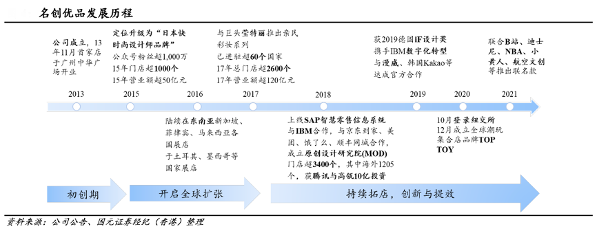 經(jīng)典案例:根據(jù)公司公告、國(guó)元證券經(jīng)紀(jì)(香港)等綜合資訊表明,名創(chuàng)優(yōu)品在零售數(shù)字化、研發(fā)設(shè)計(jì)及 IP 聯(lián)名加大投入,包括成立原創(chuàng)設(shè)計(jì)研究院、全面上線零售信息系統(tǒng)和供應(yīng)鏈信息系統(tǒng),與迪士尼、NBA 等全球范圍的知名 IP 展開(kāi)合作等。2020年名創(chuàng)優(yōu)品于美國(guó)上市,同年成立潮玩店品牌 TOP TOY,開(kāi)啟多品牌運(yùn)作。