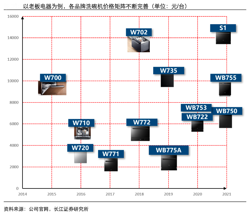 經(jīng)典案例:根據(jù)公司官網(wǎng)、長江證券研究所等綜合資訊表明,以老板為例,自其 2015 年推出第一 款售價(jià)破萬元的洗碗機(jī) W700 后,又推出數(shù)款價(jià)位更低的產(chǎn)品,滿足不同收入水平和價(jià)格接受度的用戶需求。各品牌洗碗機(jī)價(jià)格矩陣不斷完善。