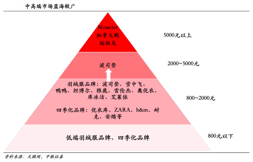 經(jīng)典案例:根據(jù)天貓網(wǎng)、中銀證券等綜合資訊表明,波司登國內(nèi)羽絨服市場市占率前五的品牌為 Moncler、加拿大鵝、波司登、雪中飛、鴨鴨。國際品牌 Moncler、加拿大鵝占領高端市場,主打 10000 元以上的高奢產(chǎn)品,始祖鳥在 5000 元以上。波司登布局中高端市場,價位在 1000 至 5000 元。由于消費者對品牌和產(chǎn)品品質(zhì)的需求日益增長,且頭部品牌萬元價格天花板下中高端市場有充足的提價空間,因此中高端市場還存在很大一片藍海。