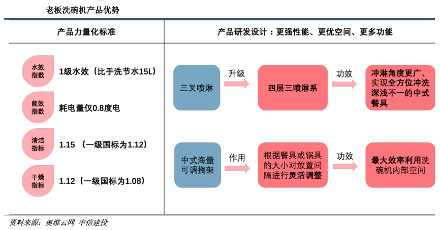 經(jīng)典案例:根據(jù)奧維云網(wǎng)、中信建投等綜合資訊表明,針對中式餐具深淺不一的特點,老板洗碗機在原有的三叉噴淋基礎上升級成四層三噴淋系,使得沖淋角度更廣,能實現(xiàn)全方位沖洗中式餐具。與此同時,針對消費者偏好大容量嵌入式洗碗機但卻又受制于廚房面積通常較小的痛點,老板產(chǎn)品研發(fā)格外注重空間利用率,在洗碗機內(nèi)置了“中式海量可調(diào)擱架",消費者可根據(jù)餐具或鍋具的大小對放置間隔進行靈活調(diào)整,以實現(xiàn)最大效率利用洗碗機內(nèi)部空間。