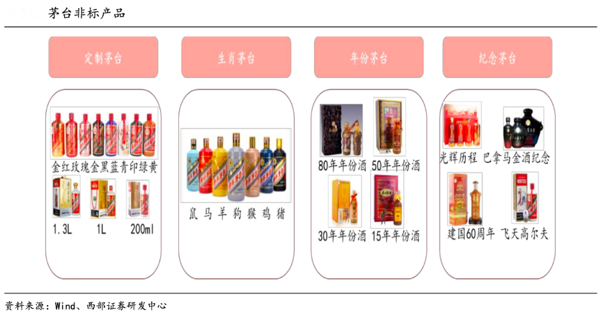 經(jīng)典案例:根據(jù)wind、西部證券研發(fā)中心等綜合資訊表明,2012年限制三公消費(fèi)后,行業(yè)進(jìn)入調(diào)整期,茅臺(tái)公司產(chǎn)量零售價(jià)大幅下降,庫(kù)存高企,公司為了改善這一 局面開(kāi)始開(kāi)發(fā)銷售非標(biāo)產(chǎn)品,其中主要包括定制酒(包括顏色茅臺(tái)/個(gè)性化定制茅臺(tái))、年 份酒(80/50/30/15 年年份茅臺(tái))、生肖茅臺(tái)(目前已有鼠/馬/羊/狗/猴/雞/豬年生肖酒)、紀(jì)念茅臺(tái)(奧運(yùn)會(huì)/巴拿馬金酒/建國(guó) 60 周年等)。