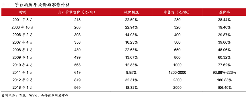 經(jīng)典案例:根據(jù)百度、wind、西部證券研發(fā)中心等綜合資訊表明,從 2016 年下半年開始,受益于白酒需求恢復(fù)以及茅臺(tái)持續(xù)供應(yīng)緊張,飛天茅臺(tái) 批價(jià)開始不斷上漲。截止目前,當(dāng)前飛天整箱批價(jià)單瓶?jī)r(jià)格在 3800 元左右,2021 年散瓶 批價(jià)在 2800 元左右,距離出廠價(jià) 969 元/瓶有巨大的價(jià)差,當(dāng)前茅臺(tái)出廠價(jià)有較大提升空 間。而且茅臺(tái)具有奢侈品屬性,品牌力和產(chǎn)品實(shí)力強(qiáng)勁,供求關(guān)系長(zhǎng)期處于緊平衡的狀態(tài), 中長(zhǎng)期來(lái)看茅臺(tái)依然具備較強(qiáng)的提價(jià)能力。從過(guò)往茅臺(tái)的出廠價(jià)增長(zhǎng)情況來(lái)看,過(guò)去十年 茅臺(tái)的出廠價(jià)年均復(fù)合增速達(dá)到 7%。