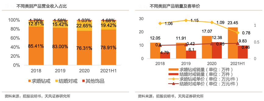 經(jīng)典案例:根據(jù)招股說明書、天風(fēng)證券研究所等綜合資訊表明,DR公司主要產(chǎn)品為求婚鉆戒、結(jié)婚對戒及其他飾品,求婚鉆戒及結(jié)婚對戒作為公司主要產(chǎn)品,2021H1 占主營業(yè)務(wù)收入比例為98.33%。從銷量上看,求婚鉆戒的銷量顯著高于結(jié)婚對戒, 2021H1 求婚鉆戒銷量達(dá) 23.45 萬,結(jié)婚對戒銷量達(dá) 9.83 萬,差距更有拉大的趨勢。