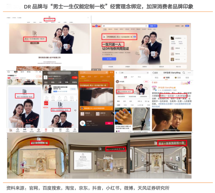 經(jīng)典案例:根據(jù)官網(wǎng)、百度搜索、淘寶、京東、抖音、小紅書、微博、天風(fēng)證券研究所等綜合資訊表明,搜索引擎、官網(wǎng)將DR品牌“男士一生僅能定制一枚”標(biāo)語列在頁面中央,聚焦視線;天貓商城、京東自營店品牌形象一致,DR品牌標(biāo)志與“男士一生僅能定制一枚”標(biāo)語綁定出現(xiàn),開通直播拉動銷量及回復(fù)消費(fèi)者對于購買規(guī)則和線下售后疑問;線下門店招牌將品牌標(biāo)志與“男士一生僅能定制一枚”并列展出,以經(jīng)營理念詮釋品牌。