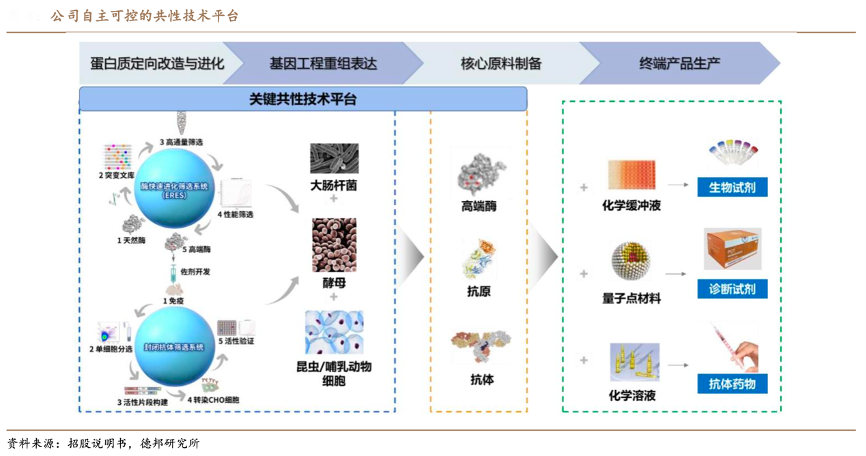 經(jīng)典案例:根據(jù)招股說明書、德邦研究所等綜合資訊表明,基于自主可控的關(guān)鍵共性技術(shù)平臺(tái),諾唯贊公司可以快速、高效、規(guī)?;剡M(jìn)行產(chǎn)品開發(fā)。其圍繞酶、抗原、抗體等功能性蛋白及高分子有機(jī)材料自主建立了覆蓋蛋白質(zhì)定向改造與進(jìn)化、基于單 B 細(xì)胞的高性能抗體發(fā)現(xiàn)、蛋白質(zhì)重組表達(dá)與制備、量子點(diǎn)修飾偶聯(lián)等關(guān)鍵共性技術(shù)平臺(tái),為其新產(chǎn)品研發(fā)提供技術(shù)支持,保持市場(chǎng)競(jìng)爭(zhēng)力。