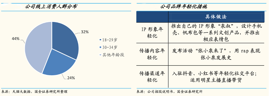經典案例:根據天貓大數(shù)據、公司招股說明書、國金證券研究所等綜合資訊表明,近年來線上渠道端的消費對象呈現(xiàn)年輕化趨勢,根據統(tǒng)計,預計張小泉線上消費者以 18-29 歲的 90 后居多,占比為32%,其次是 30-34 歲的消費者,占比為24%。為了應對這一趨勢,張小泉積極推進品牌年輕化,主要通過 IP 形象年輕化、傳播內容年輕化、傳播渠道年輕化這三個方面共同推 動,使得老字號品牌煥發(fā)新生。