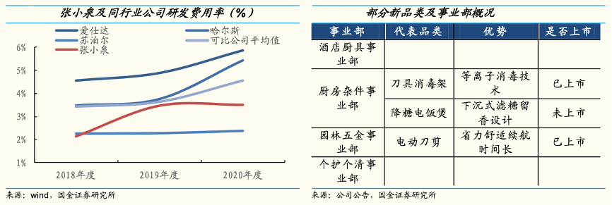 經典案例:根據wind、公司公告、國金證券研究所等綜合資訊表明,從研發(fā)端,張小泉公司內部以“賽馬機制”激活創(chuàng)新,雖然目前研發(fā)投入較同行仍有差距,但正逐步提升。從渠道端,其已成立相應事業(yè)部,對新品類進行針對性管理,并且公司線上渠道運營經驗豐富,為新品類提供最佳推廣平臺。