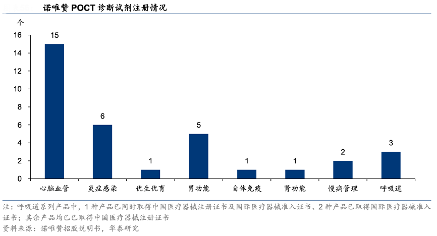 經(jīng)典案例:根據(jù)諾唯贊官網(wǎng)、華泰研究等綜合資訊表明,諾唯贊公司聚焦在關(guān)鍵原料稀缺的指標(biāo),其注冊(cè)的POCT 試劑以心腦血管、炎癥感染和胃功能為主;這些指標(biāo)基本都是關(guān)鍵供應(yīng)壟斷或進(jìn)口獨(dú)家的指標(biāo),主要用在高等級(jí)醫(yī)院,因此與其他以基層為主的國(guó)產(chǎn) POCT 試劑競(jìng)爭(zhēng)激烈的市場(chǎng)格局不同,競(jìng)爭(zhēng)壓力較小。