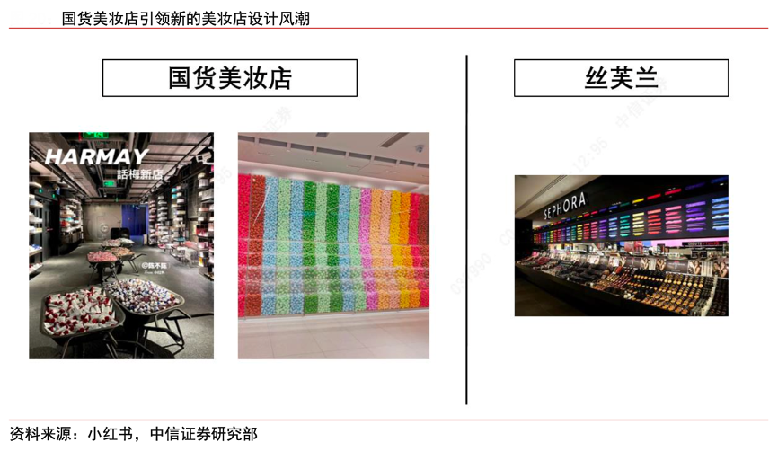 經(jīng)典案例:根據(jù)小紅書(shū)、中信證券研究部等綜合資訊表明,在美妝店領(lǐng)域,過(guò)去消費(fèi)者對(duì)美妝店的印象更多是像絲芙蘭這類(lèi)品類(lèi)較全、能夠試妝的門(mén)店,而 近年來(lái)如話(huà)梅、喜燃等新國(guó)貨美妝店的出現(xiàn),通過(guò)更有特色的裝修(工業(yè)風(fēng)、彩虹墻等) 和 KOL 的宣傳,把美妝店變成一個(gè)除了購(gòu)買(mǎi)、試妝外,還能打卡曬照的場(chǎng)景,重新定義了“美妝店的審美”。