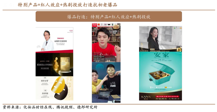 經(jīng)典案例:根據(jù)化妝品財經(jīng)在線、騰訊視頻和德邦研究所等綜合資訊表明,韓束以“特別產(chǎn)品+紅人效應(yīng)+熱劇投放”打造抗初老爆品,“老國貨”形象轉(zhuǎn)變。2019年雙十一前夕,韓束推出金剛俠面膜,上市 4 月即賣出 720 萬盒。該爆品的打造,讓韓束又重新回歸消費者視野:其由原 SK-II資深科學(xué)家山 田耕作先生研發(fā),運用肌肽抗糖化實現(xiàn)“真金賦能,無懼初老肌”的功效、臉上“貼金”具有獵奇屬性。同時產(chǎn)品多次進入李佳琦直播間,創(chuàng) 8 分鐘賣出 40 萬盒的記錄,“李佳琦推薦”成為有力標(biāo)簽。