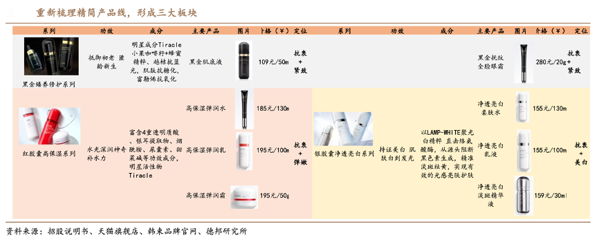 經(jīng)典案例:根據(jù)招股說明書、天貓旗艦店、韓束品牌官網(wǎng)和德邦研究所等綜合資訊表明,2021年,韓束重新梳理精簡產(chǎn)品線,推進產(chǎn)品聚焦策略。韓束精減 SKU 形成流量型與價值型產(chǎn)品組合方案,圍繞國內(nèi)領(lǐng)先科學(xué)抗衰品牌的定位形成三大板塊:1)抗衰+緊致:代表有聚時光奢養(yǎng)緊致系列、黑金臻養(yǎng)系列、 A 醇精華、金剛俠面膜。2)抗衰+彈嫩:代表有紅膠囊系列、韓束高保濕彈潤水。3)抗衰+美白:銀膠囊系列、凈透美白精華。