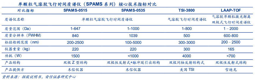 經(jīng)典案例:根據(jù)招股說(shuō)明書(shū)、安信證券研究中心等綜合資訊表明,禾信儀器公司 SPAMS 系列產(chǎn)品主要用于單顆粒氣溶膠的在線解析,技術(shù)路徑為飛行時(shí)間質(zhì)譜技術(shù)。其SPAMS-0515 在質(zhì)量范圍、質(zhì)量分辨率、粒徑檢測(cè)范圍方面與同行業(yè)同類產(chǎn)品處于同一水平,而 SPAMS-0535 在質(zhì)量分辨率、粒徑檢測(cè)范圍方面則要優(yōu)于同行業(yè)同類產(chǎn)品。