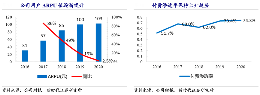 經(jīng)典案例:根據(jù)公司財(cái)報(bào)、新時(shí)代證券研究所等綜合資訊表明,家鄉(xiāng)互動(dòng)公司 2020 年 ARPU 為 103 元,同比提升 3 元,維持上升趨勢(shì);從付費(fèi)滲透率方面可以看出,公司用戶的付費(fèi)滲透率整體保持上升趨勢(shì),從活躍用戶到付費(fèi)用戶的存量用戶價(jià)值挖掘過程穩(wěn)步推進(jìn)。