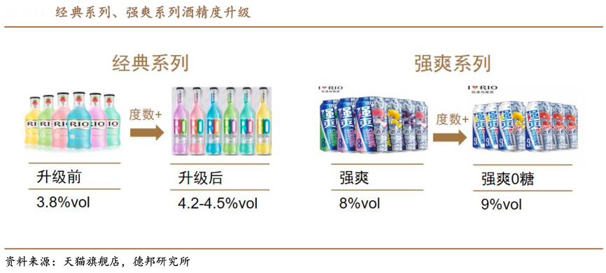 經(jīng)典案例:根據(jù)天貓旗艦店、德邦研究所等綜合資訊表明,2020年,百潤公司對經(jīng)典系列進(jìn)行產(chǎn)品升級,除包裝升級外,酒精度數(shù)從原來的 3.8%vol 上升至 4.2-4.5%vol。在強爽系列取得較好反響后,2021年其推出強爽 0 糖系列,在原基礎(chǔ)上度數(shù)+1,整體呈現(xiàn)高度數(shù)升級的趨勢。逐步提高酒精度數(shù)可以吸引更廣泛的飲酒群體,此外隨著消費者的飲酒習(xí)慣養(yǎng)成,對酒精度數(shù)的接受度也更高。