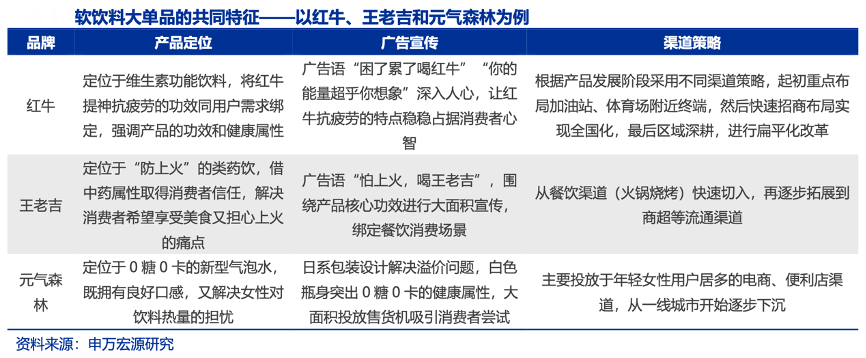 經(jīng)典案例:根據(jù)行業(yè)公開資訊、申萬宏源研究等綜合資訊表明,飲料大單品的共同特征在于:1)差異化的產(chǎn)品定位,將產(chǎn)品功效與消費者需求深度綁定;2)高頻的廣告宣傳;3)通過渠道擴張實現(xiàn)規(guī)模的快速增長。這正是出于對產(chǎn)品消費場景的深度融入,正是對產(chǎn)品經(jīng)營的嫻熟運作。