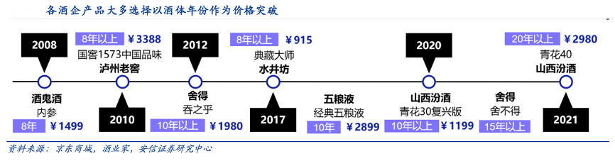 經典案例:根據京東商城、酒業(yè)家和安信證券研究中心等綜合資訊表明,酒體年份作為產品價值的清晰刻度,對高端產品價格定位具備有力支撐,國內酒企近年來做高端布局也都紛紛以“+年份”作為突破方向。