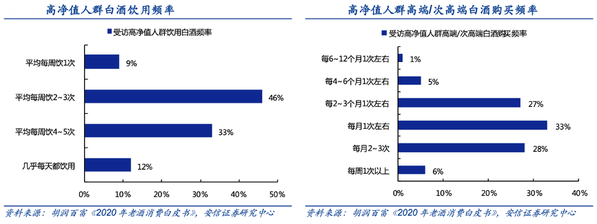 經典案例:根據胡潤百富《2020年老酒消費白皮書》、安信證券研究中心等綜合資訊表明,高凈值人群(家庭平均資產規(guī)模達 650 萬)對白酒消費有較高訴求。從消費頻次看,受訪者平均白酒飲用頻次高達每周 3.6 次,其中45%的受訪者的白酒飲用頻次在每周 4 次以上;受訪者對次高端以上白酒的平均購買頻次達每月 1.4 次,其中67%的受訪者每月都會購買,27%的受訪者會按季購買。