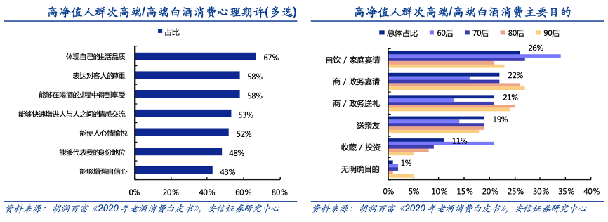 經(jīng)典案例:根據(jù)胡潤百富《2020年老酒消費白皮書》、安信證券研究中心等綜合資訊表明,結(jié)合胡潤百富調(diào)查報告顯示,品質(zhì)消費等“內(nèi)在”消費訴求已成為高凈值人群白酒消費的首要心理期許。對于已經(jīng)擁有一定社會地位的60 后、 70 后高凈值人士而言,購買次高端/高端白酒更多出于非商/政務目的,是生活品質(zhì)及個人愛好的體現(xiàn);對于處于事業(yè)發(fā)展黃金時期的 80 后、90 后而言,白酒仍然經(jīng)常在工作應酬中發(fā)揮社交功能,出于商/政務及非商/政務目的購買次高端/高端白酒的情形基本各占一半。