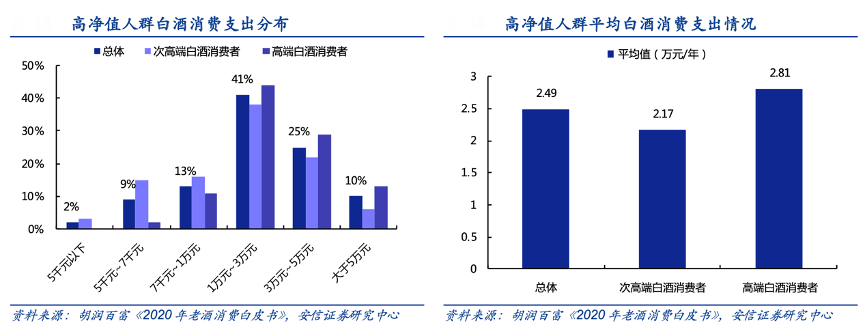 經(jīng)典案例:根據(jù)胡潤百富《2020年老酒消費白皮書》、安信證券研究中心等綜合資訊表明,從消費金額看,高凈值受訪者平均白酒消費金額高達 2.49 萬元/年,其中以次高端白酒為主的受訪者平均每年白酒消費金額約為 2.17 萬元,以高端白 酒為主的受訪者平均每年白酒消費金額約為 2.81 萬元。
