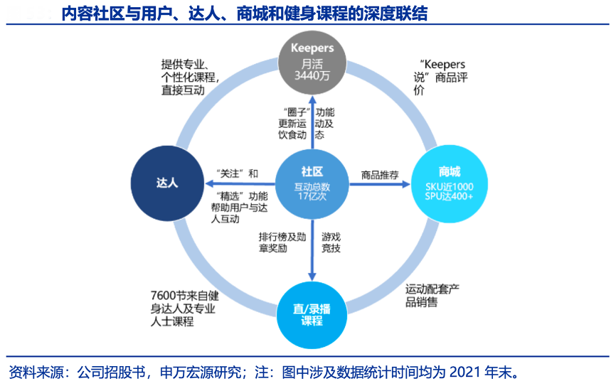 經(jīng)典案例:根據(jù)公司招股書(shū)、申萬(wàn)宏源研究等綜合資訊表明,Keep以社區(qū)為入口,用戶(hù)可以自由查看達(dá)人動(dòng)態(tài)并與其他 keepers 互動(dòng)交流;運(yùn)動(dòng)中,用戶(hù)可通過(guò)組隊(duì)競(jìng)技、分組游戲化挑戰(zhàn)提高其在直、錄播課程中的體驗(yàn)感和參與感;此外,keepers 推 薦和評(píng)價(jià)便于為健身品商城引流,完成業(yè)務(wù)變現(xiàn)的閉環(huán)。根據(jù)招股書(shū),2021年,平臺(tái)社區(qū)互動(dòng)總數(shù)達(dá) 17 億次,用戶(hù)將平臺(tái)的內(nèi)容直接從 Keep 分享到社交媒體平臺(tái)累計(jì)超過(guò) 3900萬(wàn)次;平臺(tái)在微博上積累了約 12 億次瀏覽量。2020 年平臺(tái)核心用戶(hù)的平均第 12 個(gè)月留存率為 49.3%,表現(xiàn)出強(qiáng)大的用戶(hù)忠誠(chéng)度及黏性。