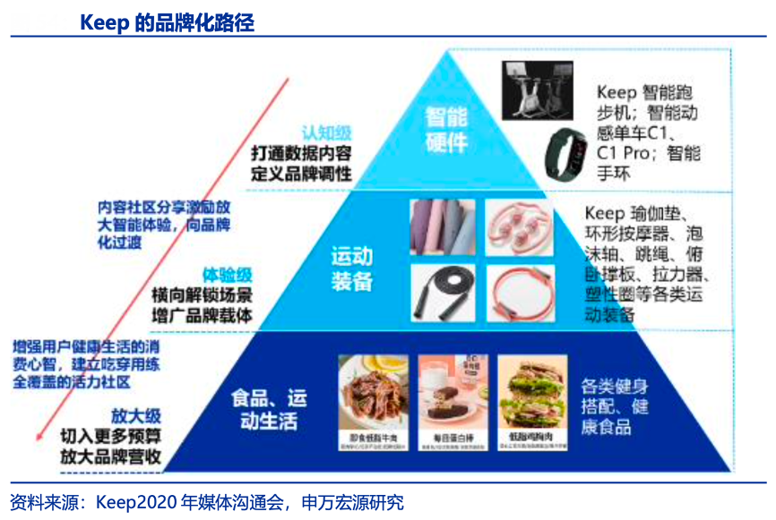 經(jīng)典案例:從Keep2020年媒體溝通會(huì)、申萬(wàn)宏源研究等綜合資訊表明,Keep以?xún)?nèi)容社區(qū)為依托,Keep建立起代表健康生活方式的“下一代品牌”,其自有品牌消費(fèi)品全面覆蓋用戶(hù)健身生命周期。內(nèi)容社區(qū)的使用分享、達(dá)人推薦放大了產(chǎn)品使用體驗(yàn)和營(yíng)銷(xiāo)效果、激勵(lì)用戶(hù)運(yùn)動(dòng),長(zhǎng)期具備高活躍度和高影響力的內(nèi)容社區(qū)在用戶(hù)之間建立起了健康生活的消費(fèi)心智,進(jìn)而促進(jìn)了運(yùn)動(dòng)裝備類(lèi)、 輕食類(lèi)及運(yùn)動(dòng)服飾類(lèi)自有品牌產(chǎn)品的銷(xiāo)售,其或?qū)⒂瓉?lái)品牌溢價(jià)下,“吃、穿、用、練” 多場(chǎng)景、全覆蓋的營(yíng)收增長(zhǎng)。