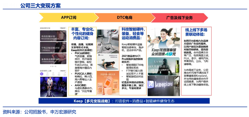 經(jīng)典案例:根據(jù)公司招股書(shū)、申萬(wàn)宏源研究等綜合資訊表明,以流量為基礎(chǔ),Keep公司打造軟件+消費(fèi)品+智能硬件的健身生態(tài),降低運(yùn)動(dòng)門(mén)檻,提升運(yùn)動(dòng)體驗(yàn),在全流程運(yùn)動(dòng)方案中促成流量變現(xiàn)。目前其公司的收入來(lái)源主要包括會(huì)員訂閱及線(xiàn)上付費(fèi)內(nèi)容、自有品牌產(chǎn)品、廣告和其他服務(wù)(含線(xiàn)下健身館收入),2021年前三季度其收入占比分別為 33%、55%、12%,毛利率分別為59%、29%、60%。