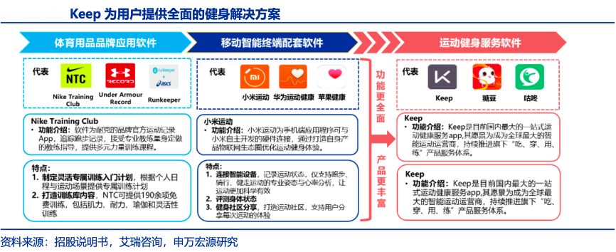 經(jīng)典案例:根據(jù)招股說(shuō)明書(shū)、艾瑞咨詢(xún)、申萬(wàn)宏源研究等綜合資訊表明,目前市場(chǎng)上能夠提供健身服務(wù)的軟件主要有三大類(lèi):以 Keep 為代表的運(yùn)動(dòng)健身服務(wù)軟件、以 Nike Training Club 為代表的體育用品品牌應(yīng)用軟件和以華為健康為代表的移動(dòng)智能終端配套軟件。Keep支持從線(xiàn)上到線(xiàn)下,從產(chǎn)品到服務(wù),多場(chǎng)景滿(mǎn)足用戶(hù)的健身需求,具有“一站式”的優(yōu)勢(shì),且相比于其他智能終端,keep 能夠有效激勵(lì)用戶(hù)參與,提供各類(lèi)服務(wù)及產(chǎn)品簡(jiǎn)化用戶(hù)的運(yùn)動(dòng)決策,是吃、穿、用、練全覆蓋 的智能健身平臺(tái)運(yùn)營(yíng)商。