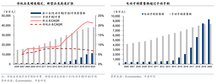 經(jīng)典案例:根據(jù)Euromonitor、華泰研究等綜合資訊表明,新興品類包括漱口水、電動牙刷、牙貼、牙線等品類,新品類零售額高速擴張,2006-2020年CAGR21.2%,20年新品類市場總零售額 112.8 億 元,占比 23%。隨著電動牙刷普及率的提升,電動牙刷零售額超過手動牙刷,2020 年達 93.4 億元;據(jù)捷孚凱(GFK)數(shù)據(jù),除電動牙刷外,沖牙器也成為 2021 年熱門品類,2021 年上半年銷售額同比增長 95%,銷量同比增長 128%,2020 年銷量和銷售額分別為 288 萬 臺和 17.1 億元。