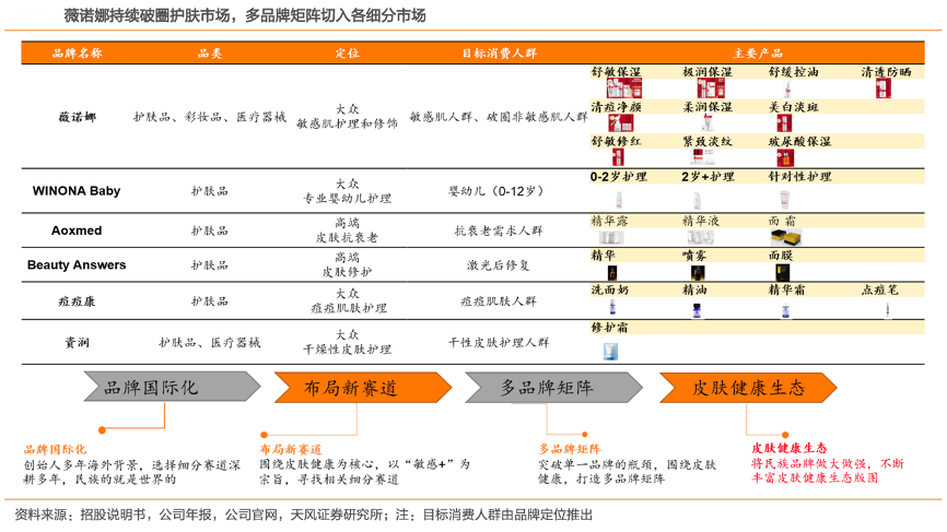 經(jīng)典案例:根據(jù)公司官網(wǎng)、招股說明書、公司年報、天風(fēng)證券研究所等綜合資訊表明,貝泰妮以薇諾娜為基本盤,采取多品牌策略切入細(xì)分市場,針對各市場特點采取針對性渠道策略,并持續(xù)拓展品牌矩陣。目前其旗下有薇諾娜、WINONA Baby、Aoxmed、Beauty Answers、痘痘康和資潤等品牌,覆蓋皮膚學(xué)級護膚品、嬰幼兒護膚品、強功效性護膚品等品類。