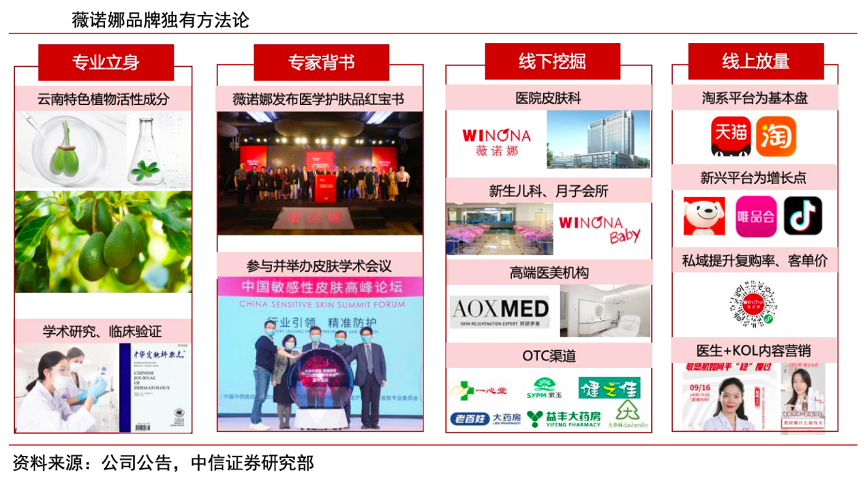 經(jīng)典案例:根據(jù)公司公告、中信證券研究部等綜合資訊表明,貝泰妮公司通過主品牌薇諾娜的發(fā)展探索出了獨(dú)有的“貝式”方法論:專業(yè)立身,專家背書,線下挖掘,線上放量。該方法論以高產(chǎn)品力為起點(diǎn),即產(chǎn)品要真正做到安全、有效;同時 整合皮膚科醫(yī)生、學(xué)術(shù)會議/論壇、醫(yī)院渠道等資源,在線下挖掘出目標(biāo)客群,通過內(nèi)容營銷、全域運(yùn)營在線上渠道放量、出圈。