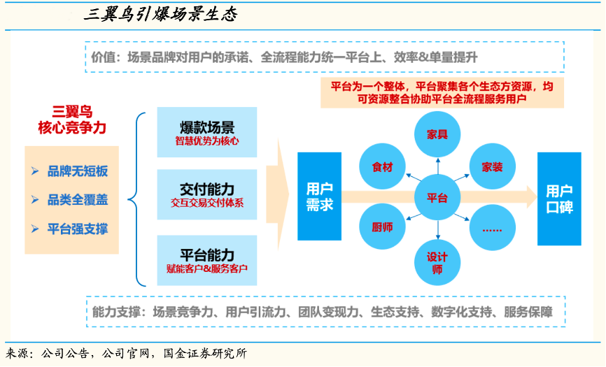 經(jīng)典案例:根據(jù)公司公告、公司官網(wǎng)、國金證券研究所等綜合資訊表明,卡薩帝三翼鳥具有“1+N ”服務體系,通過一個服務管家、一個項目經(jīng)理,即可協(xié)同家電服務人員、成套服務商、經(jīng)銷商、家裝公司等N個資源方,是一個多方資源匯集、最終輸出整體解決方案給客戶的平臺。消費者僅需在 APP 上一鍵下單,各個資源方將在三翼鳥的牽頭整合下,協(xié)同為用戶提供全流程的設計與 交付服務 ,對公司的數(shù)字化 能力和對 生態(tài)方的 管理能力提出了高要求。