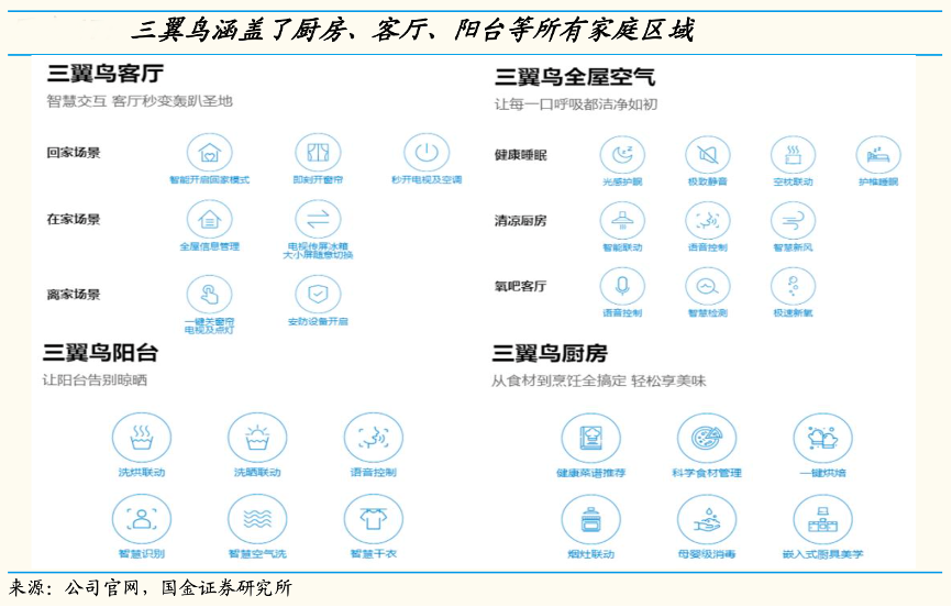 經(jīng)典案例:根據(jù)公司官網(wǎng)、國金證券研究所等綜合資訊表明,行業(yè)普遍銷售模式以單品為主,卡薩帝推出了套系產(chǎn)品(指揮家、 帝博、銀河等),三翼鳥實現(xiàn)全空間全品類套系家電。