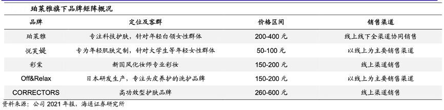 經典案例:根據公司2021年報、海通證券研究所等綜合資訊表明,珀萊雅公司致力于構建新國貨化妝品產業(yè)平臺,主要從事化妝品類產品的研發(fā)、生產和銷售。旗下主要擁有“珀萊雅”、“彩棠”、“Off&Relax”、“悅芙媞”、“CORRECTORS”、“優(yōu)資萊”、“韓雅”等品牌。其自有品牌已覆蓋大眾精致護膚、彩妝、洗護、高功效護膚等美妝領域。