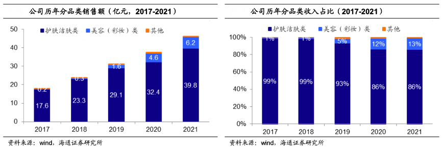 經典案例:根據wind、海通證券研究所等綜合資訊表明,珀萊雅成功打造第二品牌彩棠,帶動彩妝品類收入快速增長。從分品類收入結構看,自2019年公司收購彩棠品牌后,美容(彩妝)類產品銷售收入快速增長、占比持續(xù)提高,2019 年、2020 年、2021 年分別為 5%、12%、13%,穩(wěn)步提高。