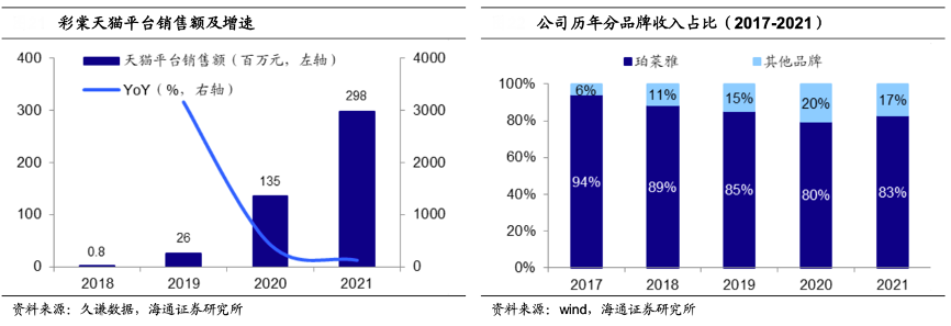 經(jīng)典案例:根據(jù)久謙數(shù)據(jù)、wind、海通證券研究所等綜合資訊表明,從分品牌收入結(jié)構(gòu)看,2017年以來(lái)珀萊雅公司其他品牌的收入占比穩(wěn)步提高,從 2017 年的 6%逐年提升至 2021 年的 17%。其中,彩棠天貓平臺(tái)銷(xiāo)售額由2020 年的 1.35 億 元上升至 2021 年的 2.98 億元,同比增長(zhǎng) 121%,是驅(qū)動(dòng)其他品牌收入增長(zhǎng)的主力。