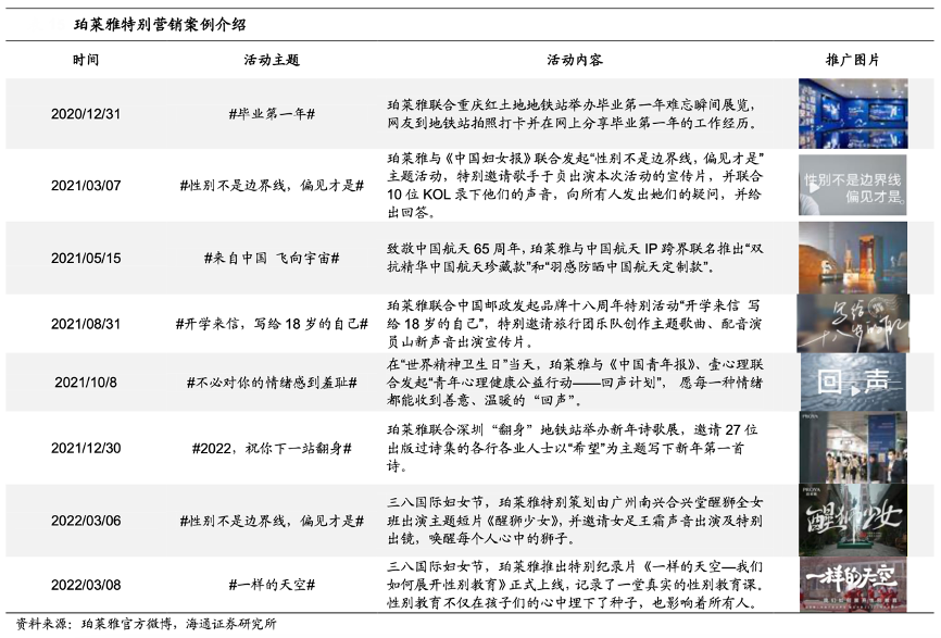 經(jīng)典案例:根據(jù)珀萊雅官方微博、海通證券研究所等綜合資訊表明,2021年三八婦女節(jié),珀萊雅與《中 國(guó)婦女報(bào)》聯(lián)合發(fā)起“性別不是邊界線,偏見(jiàn)才是”主題活動(dòng),當(dāng)天發(fā)布的推廣視頻引起廣大網(wǎng)友的討論。為慶祝中國(guó)航天 65 周年,珀萊雅與中國(guó)航天 IP 聯(lián)合發(fā)布了多款聯(lián)名產(chǎn)品;2021年 10 月 10 日“世界精神衛(wèi)生日”,珀萊雅與《中國(guó)青年報(bào)》、壹心理開(kāi)展了多項(xiàng)活動(dòng),關(guān)注青年的心理健康,隨后“珀萊雅回聲計(jì)劃”系列紀(jì)錄片正式播出,與了解心理疾病的各領(lǐng)域達(dá)人傾聽(tīng)大眾的聲音。