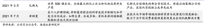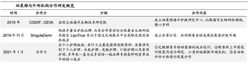 經(jīng)典案例:根據(jù)公司官方公眾號(hào)、海通證券研究所等綜合資訊表明,2021年公司與亞什蘭達(dá)成戰(zhàn)略合作,亞什蘭定做獨(dú)家專(zhuān)供珀萊雅的成分設(shè)計(jì)、在新原料上市和功效評(píng)價(jià)方面進(jìn)行深度合作。同年3月與巴斯夫達(dá)成戰(zhàn)略合作,巴斯夫全球領(lǐng)先的部分首創(chuàng)技術(shù),將通過(guò)珀萊雅公司的產(chǎn)品,在國(guó)內(nèi)實(shí)現(xiàn)獨(dú)占或率先運(yùn)用;同年 7 月與帝斯曼在技術(shù)與市場(chǎng)等領(lǐng)域的獨(dú)特資源與優(yōu)勢(shì)進(jìn)行深度融合。
