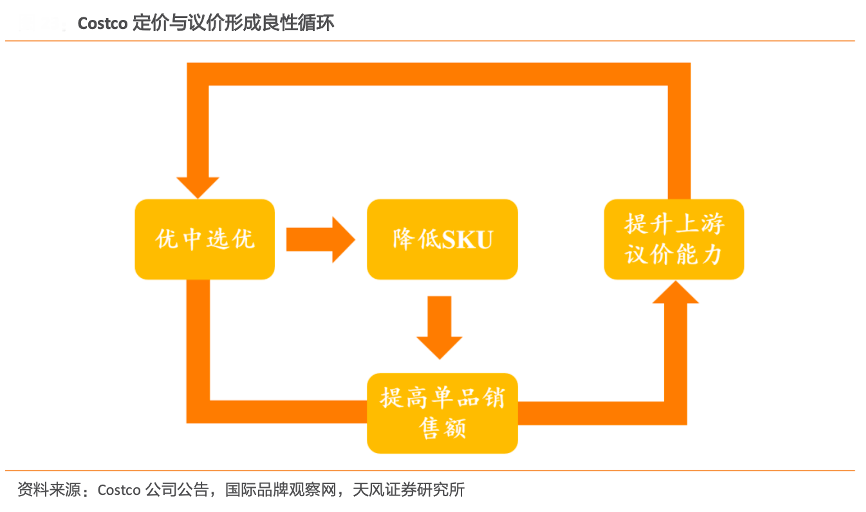 經(jīng)典案例:根據(jù)Costco公司公告、國(guó)際品牌觀察網(wǎng)、天風(fēng)證券研究所等綜合資訊表明,Costco低SKU+高質(zhì)量產(chǎn)品,定價(jià)與議價(jià)產(chǎn)生良性循環(huán)。Costco除提供普通 大賣場(chǎng)銷售商品外,還出售各種電子產(chǎn)品、大型家電等長(zhǎng)尾品類,但其線下門店的 SKU 數(shù)仍控制在僅 4000 左右,關(guān)鍵就是緊扣會(huì)員偏好選品,大包裝模式與批發(fā)購(gòu)買帶來的低單價(jià)能夠有效刺激會(huì)員的購(gòu)物欲望,從而形成了定價(jià)與議價(jià)的良性循環(huán)。