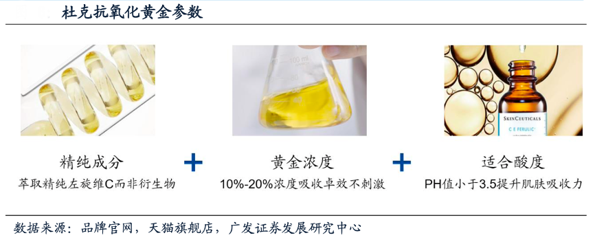 經(jīng)典案例:根據(jù)品牌官網(wǎng)、天貓旗艦店、廣發(fā)證券發(fā)展研究中心等綜合資訊表明,修麗可品牌的創(chuàng)立源于Dr. Pinnell發(fā)現(xiàn)“黃金抗氧化”配方并推出第一代精純左旋維生素C產(chǎn)品,此外還獲得了改寫抗氧化領(lǐng)域發(fā)展史的“杜克抗氧化參數(shù)”專利,即左旋維生素C只有滿足三個標(biāo)準(zhǔn)才能充分發(fā)揮其性能:精純成分、黃金濃度及適合酸度。