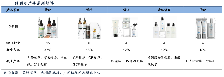 經(jīng)典案例:根據(jù)品牌官網(wǎng)、天貓旗艦店、廣發(fā)證券發(fā)展研究中心等綜合資訊表明,修麗可以15%左旋維生素C為主打核心成分成就抗氧化權(quán)威,并持續(xù)推進(jìn)研發(fā)創(chuàng)新,以玻色因、傳明酸、復(fù)合植萃等為主要成分,陸續(xù)推出多種滿足在抗氧化基礎(chǔ)上不同細(xì)分需求的產(chǎn)品,各個產(chǎn)品間功效互補,科學(xué)搭配使用可以全方位解決肌膚問題。目前產(chǎn)品系列包括修護(hù)、預(yù)防、保濕、清潔調(diào)理、保護(hù),其中修護(hù)及預(yù)防類SKU數(shù)量占比較高,分別為45%及18%。